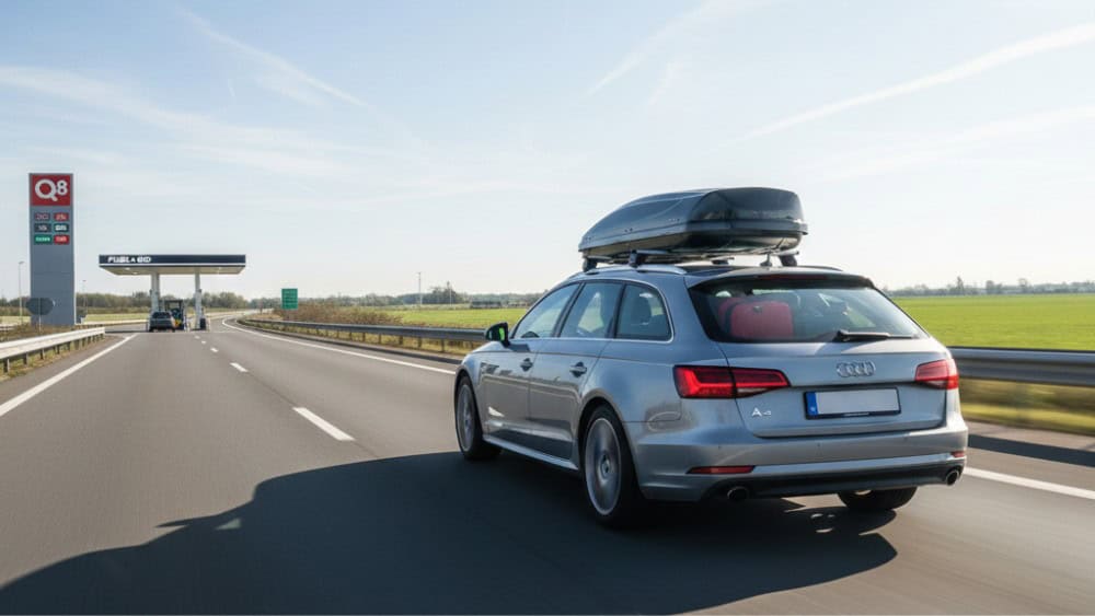 • Extra accessoires: Dakkoffers en fietsendragers verhogen luchtweerstand.